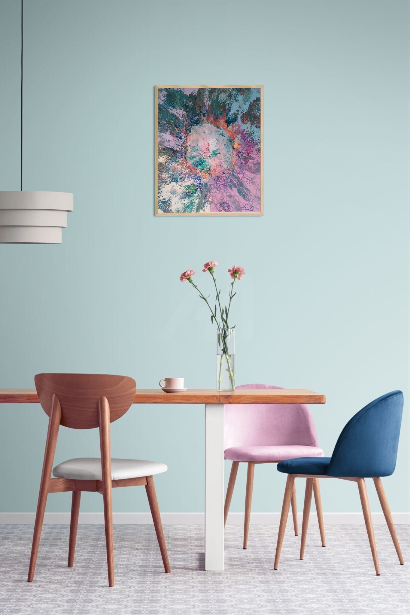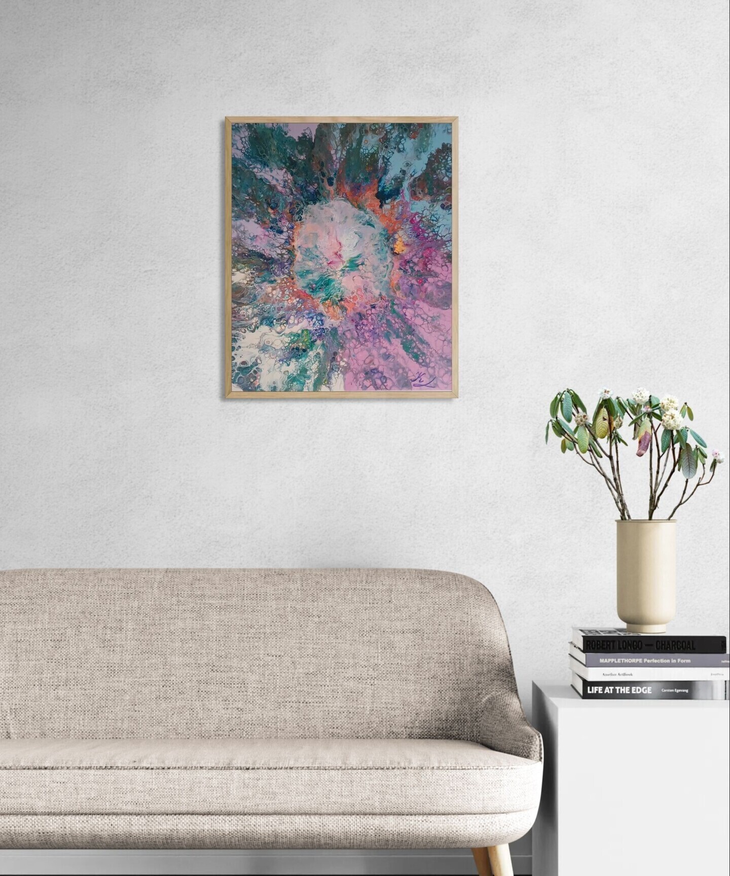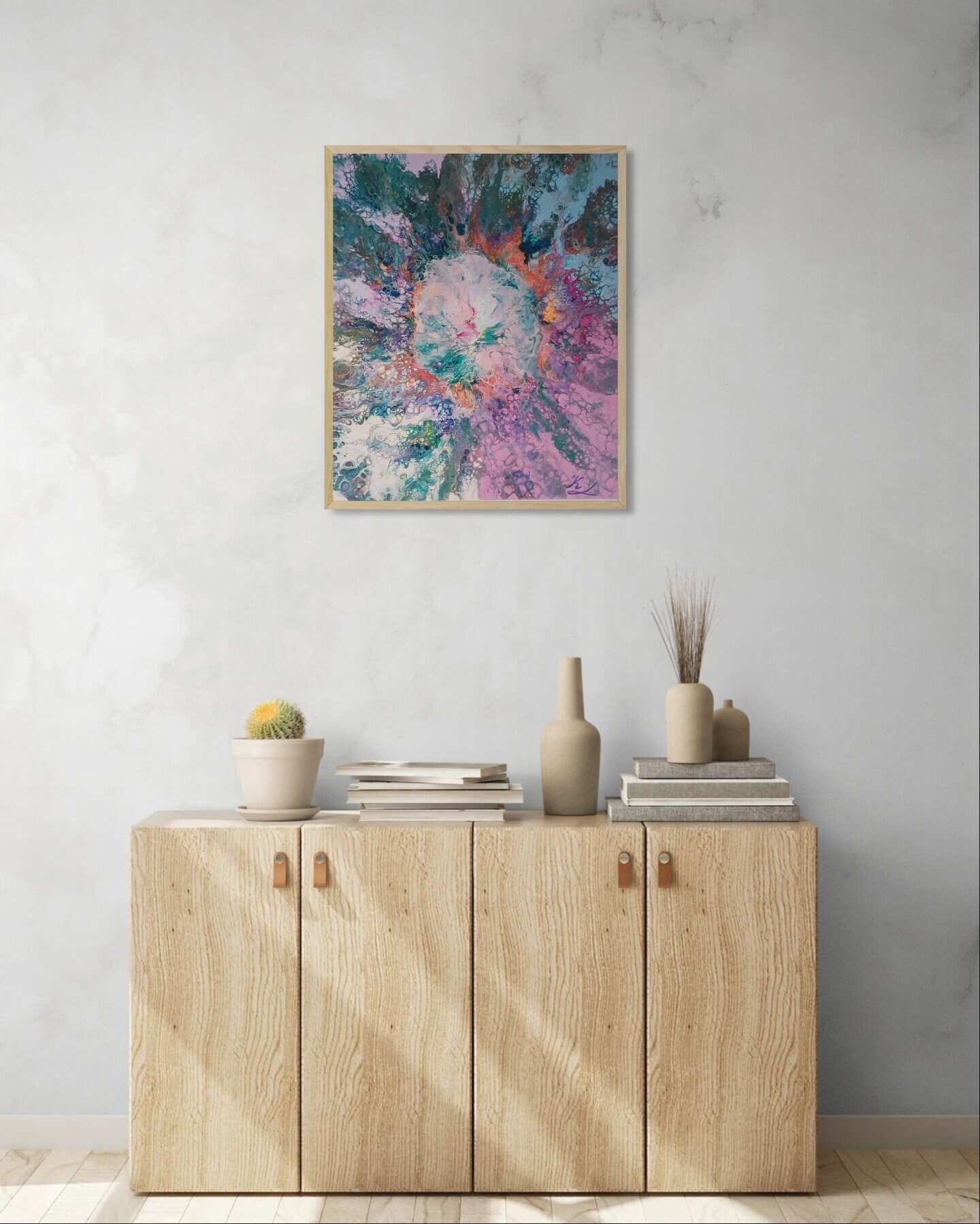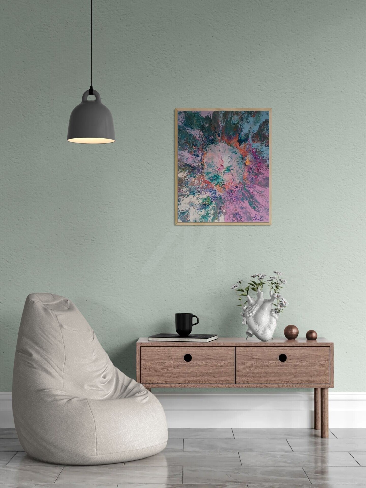 A radiant flow of pinks, greens, and violets bursts from the center like a living heart — the source of love and creation itself. This artwork carries the vibration of a mother’s fulfilled soul, surrounded by the joyful energy of her realized and loving children. Every color pulse feels like a heartbeat — calm, steady, and full of gratitude for life’s harmony.