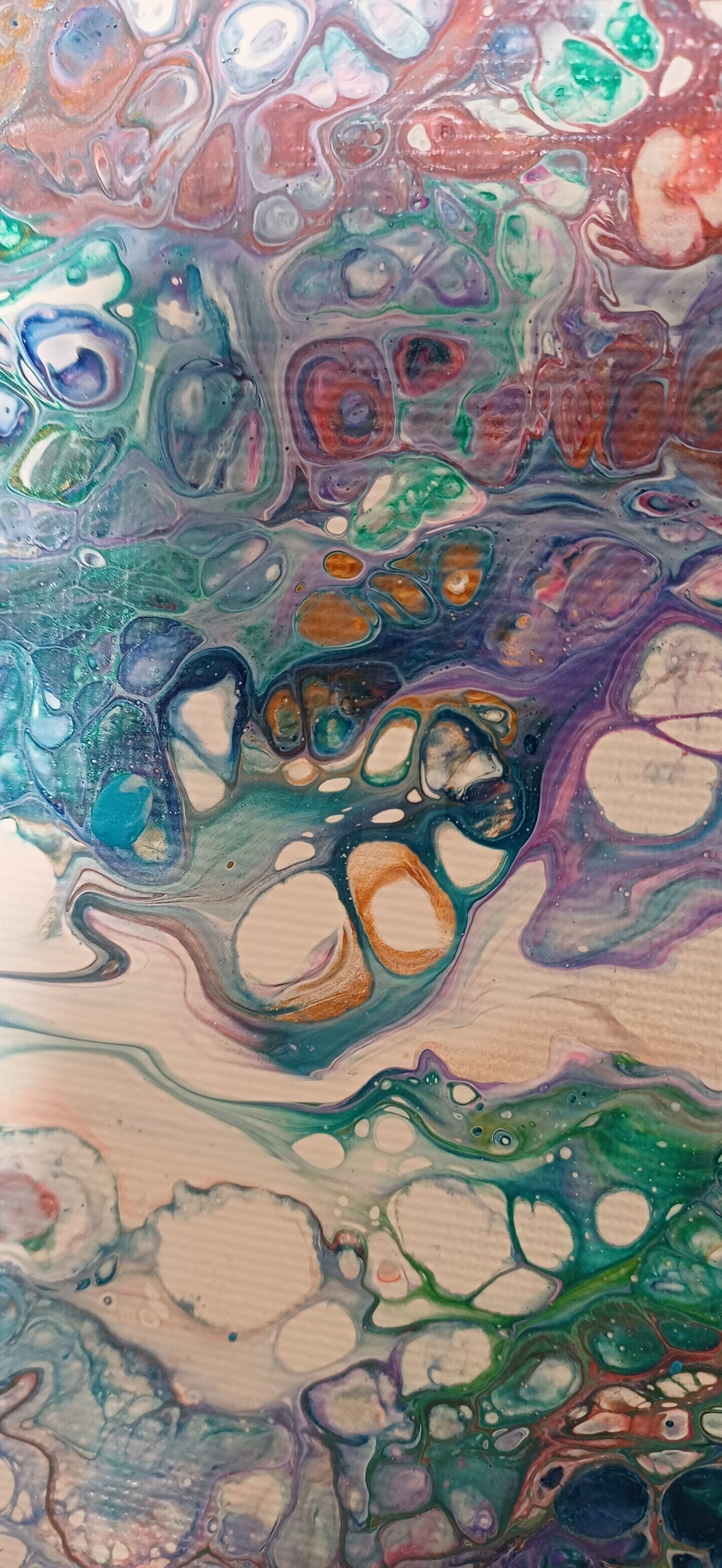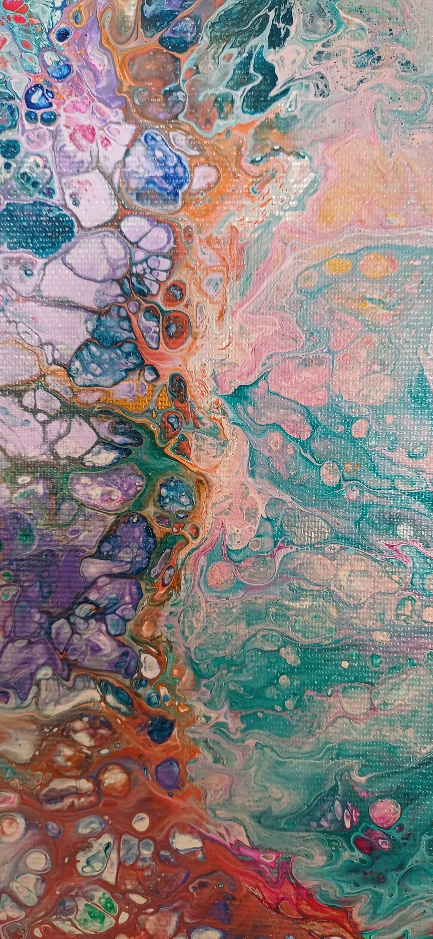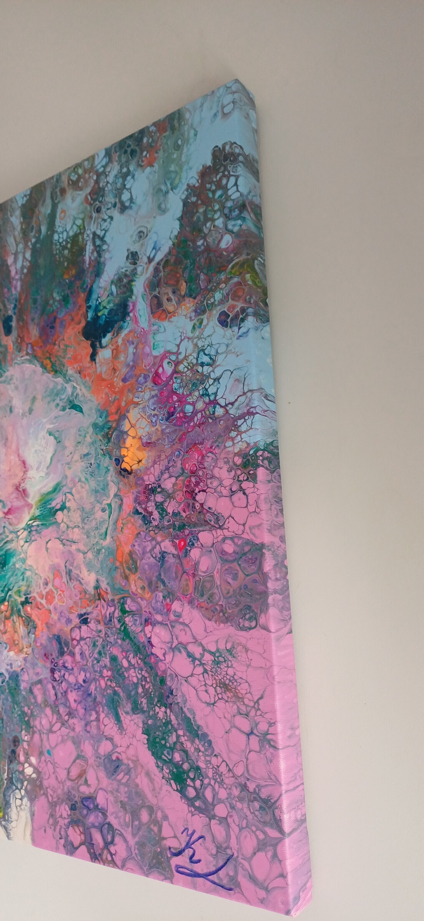 Look closer, and you’ll sense both tenderness and power. Layers of luminous paint create a living texture — like waves of love expanding through space. The organic shapes and fluid forms evoke growth, birth, and the eternal flow of giving and receiving love.